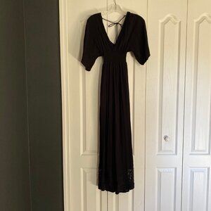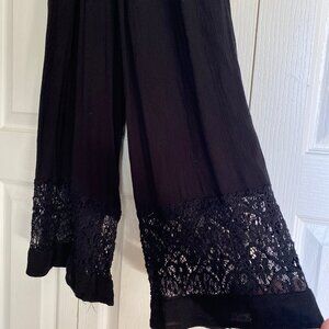 Quarter-sleeve black jumpsuit with lace accents. Linen-style fabric with a relaxed yet elegant silhouette. Super comfy and perfect for day-to-night styling. Excellent condition. Petite.