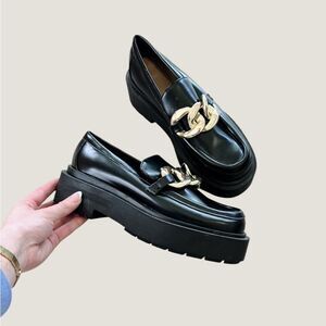 Black Loafers with Gold Chain Detail