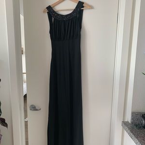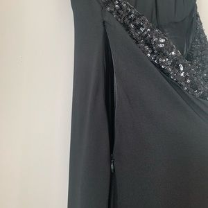 Black Long Dress with sequins appliqué open back. Worn once. Pre owned but in perfect condition. Refer pictures for measurements. Will fit a S and M sizes due to stretch fabric.