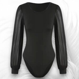 Chic black long sleeve bodysuit featuring elegant sheer puff sleeves and a smooth, stretchy body for a sleek, flattering fit. The lightweight mesh sleeves add a soft, feminine touch, while the fitted bodice tucks perfectly into jeans, trousers, or skirts. Ideal for evenings out, date nights, work outfits, or elevated everyday wear.