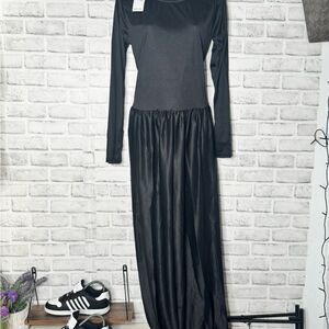 This stunning black romper features long sleeves and a flattering crew neck design. An elegant silhouette perfect for a night out. Its full-length style adds a touch of sophistication to any evening event.