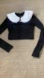 This black, long sleeve shirt features a ribbed knit fabric and a kawaii style collar with scalloped edges, giving it a unique and cottage core, kawaii style look.