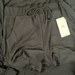 Bottom: A pair of knit ribbed shorts featuring a high-rise elasticized waist, side pockets