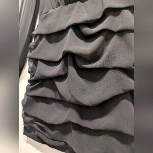 Has: Plunge neckline, Side zip, Shoulder pads, Ruched, Button sleeves, Sheer bishop sleeves