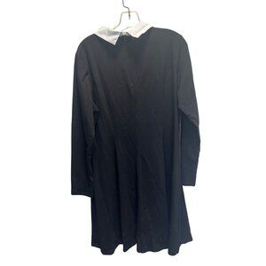 This black long-sleeve dress features a crisp white Peter Pan collar and a back zipper closure. Suitable for professional or formal settings.