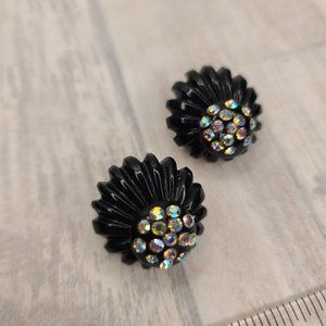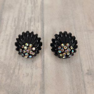 Really pretty and sparkly vintage thermoset AB crystal and black carved lucite earrings.