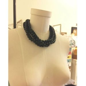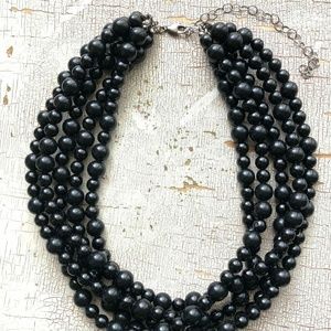 Black beaded necklace featuring 5 strands of lightweight lucite beads. This 5 strand statement necklace style is known as the Sylvie Necklace. Beads are shiny opaque finish in that great retro look & they were made in the 1960's. Necklace measures 15.5-16" at it's shortest + a 6" extender. Lightweight and fun to wear: a classic style that will outlast trends.