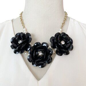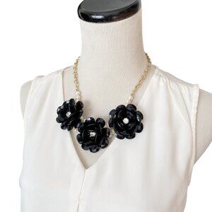 Black Lucite Rose Bib Statement Necklace with Rhinestones Adjustable Length