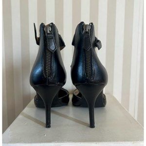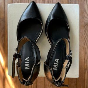 Size 7 black pleather heels. MIA brand. Ankle strap with buckle. Pointed toe. 3 inch heel. Used in good condition.