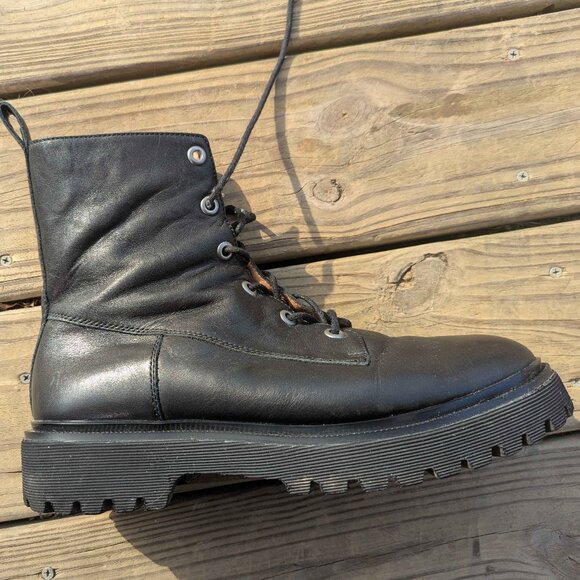 Size 12 leather lace-up boots. Moderate wear throughout, scuffing at the front of the right foot. Laces may need replacing but shoes themselves still have plenty of life left, and are surprisingly comfy!