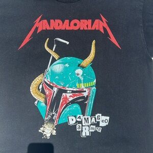 Black t-shirt featuring a Mandalorian graphic with red and green accents.