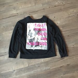 This petite, black sweatshirt has a poster image of Marilyn Monroe in black and white on the front with hot pink words that say: T.G.I.F. "Thank God I'm Fabulous" It has a "ripped" back, which just adds to the glam
