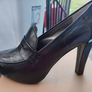 Brand new never worn in box size 7.5 "Black Glazed Goat London" shoes. Black with silver accent on heel. Loafer look with elegant design.