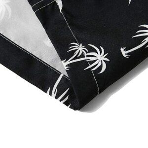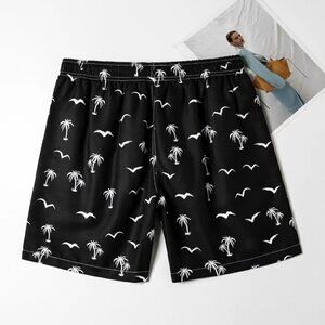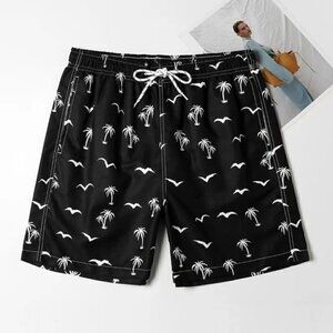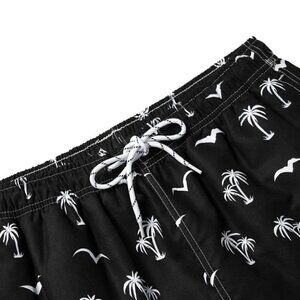 Black Vacation Style Mens Coconut Tree & Bird Print Drawstring Waist Swim Trunks