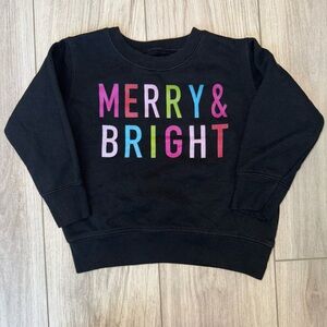 Black sweatshirt with colorful 'Merry & Bright' text.