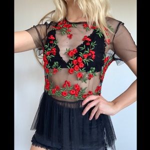 - Black mesh top with red floral embroidery