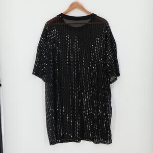 Black Mesh Sequin Tunic Dress Oversized Sheer T-Shirt Mini Clubwear One Size