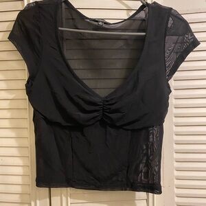 Stylish black mesh top with short sleeves. Perfect for a chic look.