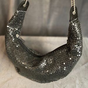 Black mesh shoulder bag, hobo style with zipper and chain shoulder strap. Evening wear.