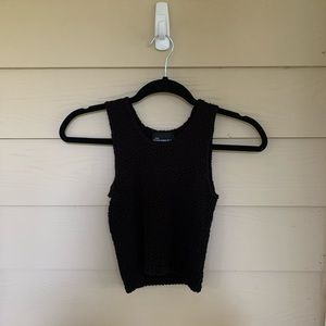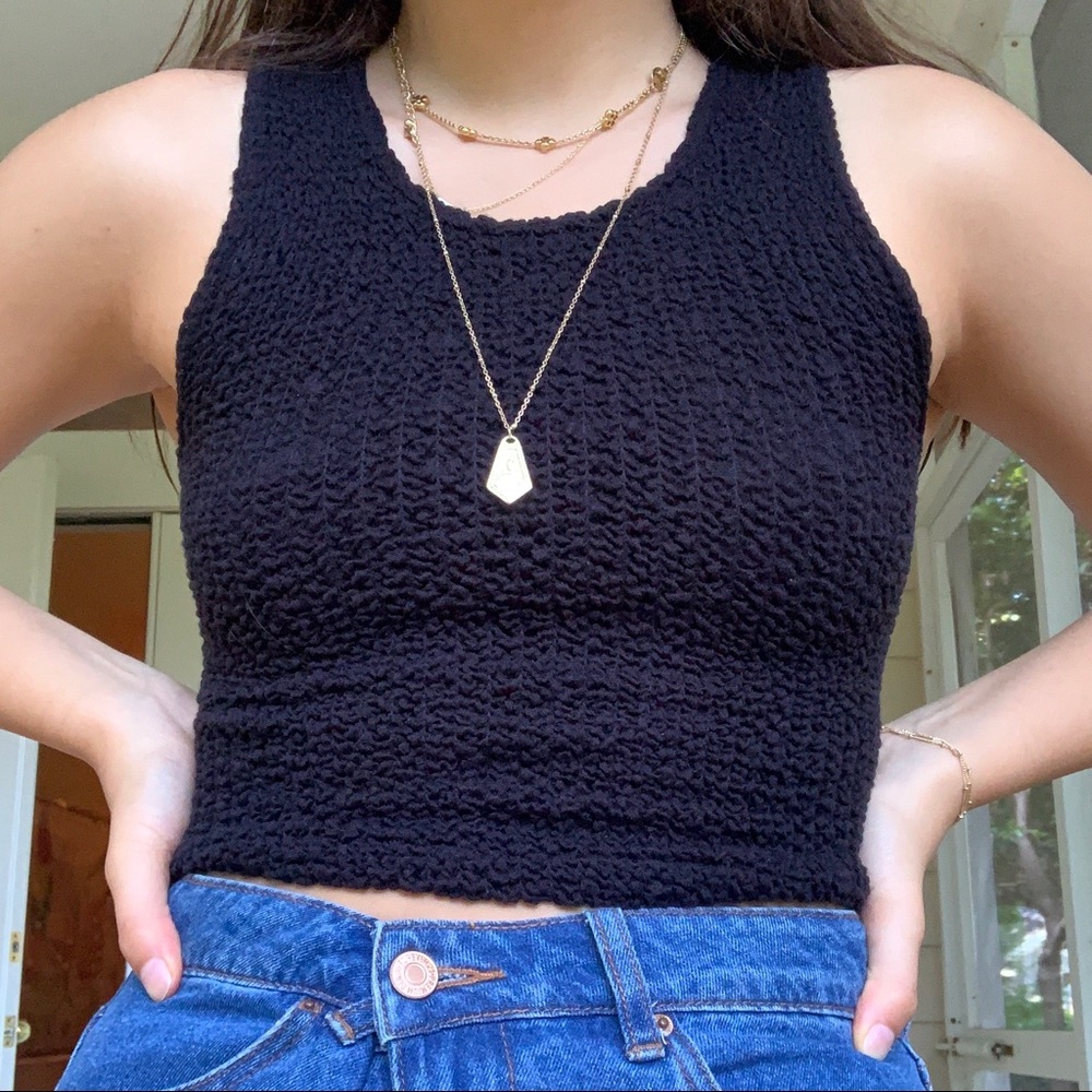 It’s like stretchy, mesh, ribbed material. Sits a bit cropped. It feels very high quality when wearing it too. A nice, basic staple for every outfit. The tag says XL but a S-L could easily fit as well.