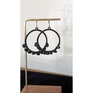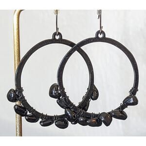 Black Metal Black Stone Hoop Dangle French Wire Earrings. Hoop is 1.5" in diameter. Pre-owned, these earrings with the wired on stones are in great condition.