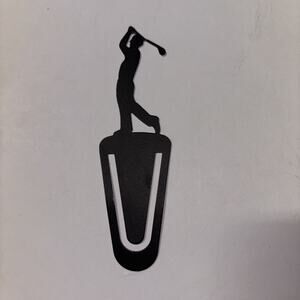 The product is a black metal golfer bookmark featuring a golf man design. This stylish and unique accessory is perfect for avid golfers or those who appreciate a touch of personality in their reading material. The metal material gives it a durable and high-quality feel, making it a great addition to any bookmark collection.