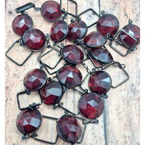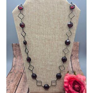 Black Metal Link Chain Dark Deep Red Round Beads Long 36" Necklace Pull Over