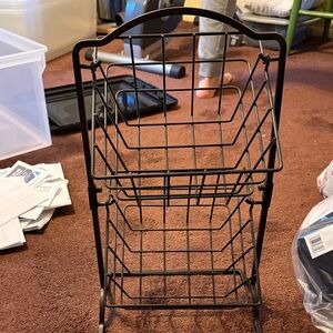 Sturdy black metal wire storage rack. Perfect for organizing spaces. 2 baskets…8”x8”x5”. Stand is 18” tall.