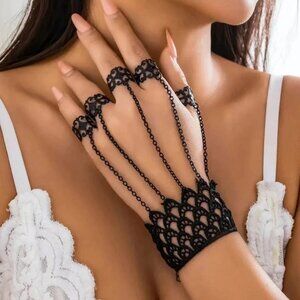 Pretty goth style bracelet with attached adjustable finger rings is a great option for Halloween costume accessory.