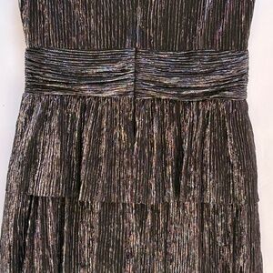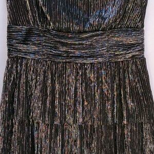 Turn heads in this stunning black metallic pleated dress, featuring a subtle multi-color shimmer that catches the light beautifully. The cinched ruched waistband flatters your figure, while the tiered skirt adds texture and movement for a glamorous, feminine silhouette. Perfect for cocktail parties, evening events, or holiday celebrations.
