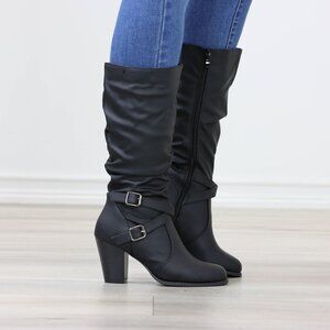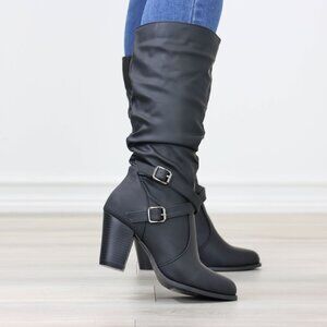 Black Mid Calf Block Heeled Boots Synthetic Leather Pointed Toe Womens
