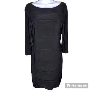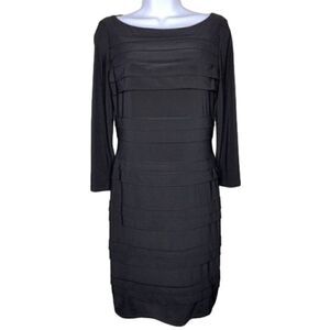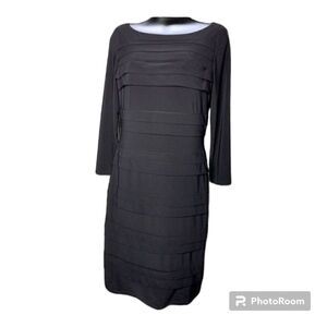 Discover sophistication with this American Living black midi dress featuring elegant tiered design and 3/4 sleeves, suitable for formal occasions.