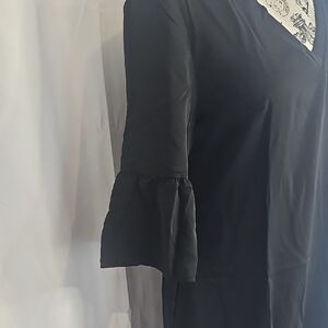 This elegant black midi dress showcases a chic v-neckline and 3/4 bell sleeves, making it ideal for both casual and work occasions. Its sheath style offers a sleek silhouette, while the minimalist design ensures timeless appeal.