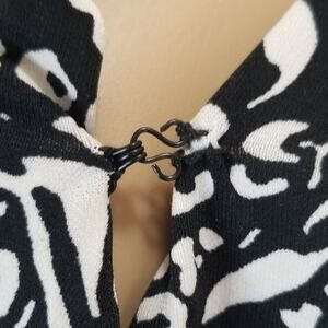 H Halston v neck wrap top short sleeve stretchy black knee length dress. Hook and eye closure at center of front neckline. Short collar falls into neckline. Elastic waist. Straight skirt.