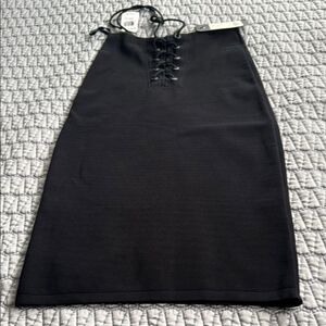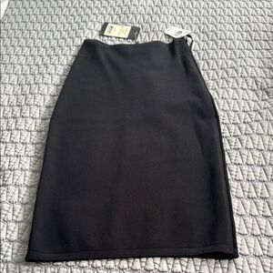 This black midi pencil skirt is designed for cocktail occasions, featuring a sleek and form-fitting silhouette that extends to mid-calf. Its high waist and subtle textured pattern add sophistication and elegance, making it a versatile choice for a night out.