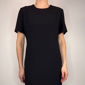 Classic and minimalist, featuring a clean silhouette with short sleeves, a crew neckline, and a back zip closure. Made in the USA from a structured polyester-spandex blend, the dress offers a flattering drape with light stretch. Perfect as a timeless wardrobe staple or an understated formal piece