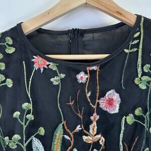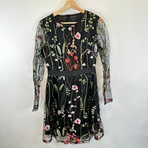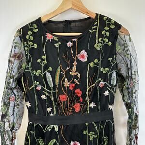 Black Midi Sheer Sleeve Embroidered Floral Knee Length Dress Womens Size Small