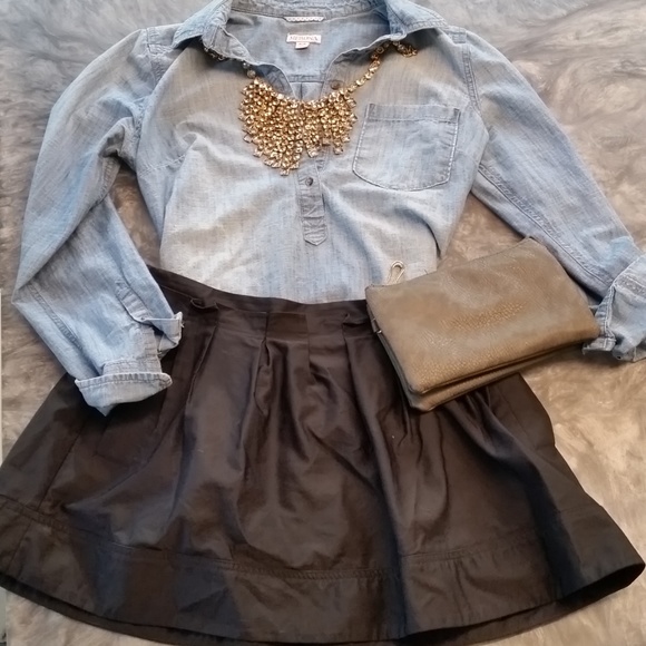Black pleated mini skirt with structured bottom. The pockets give it a fun, dressy casual feel.