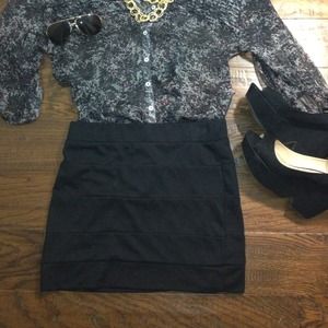 Very short black stretchy mini skirt. Not the most expensive but looks good if paired with the right clothes/accessories. Pairs well with tights in winter or the right legs in summer! Can fit anyone size 4-6