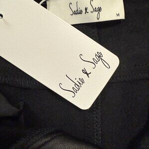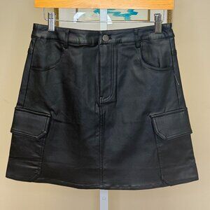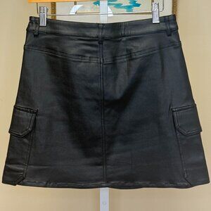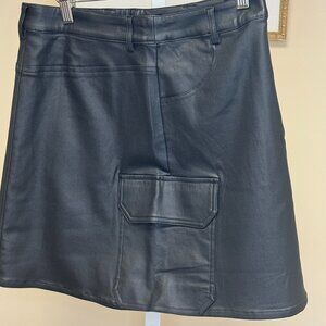Black Faux leather mini skirt. Very soft along with the lining. She hosts a zipper and button front, front pockets along with side pockets. 76% Viscose, 21% Nylon and 3% spandex. Brand new with tags.