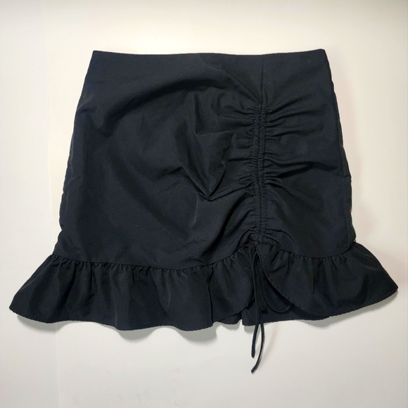 This chic black mini skirt is perfect for a night out, featuring a ruched detailing and a playful ruffled hem for added flair.