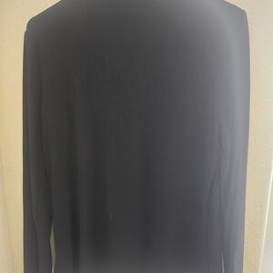 Elegant black long sleeve top by Adele & May, size large but fits likea medium. Features a romantic floral lace overlay across the chest and shoulders, with a soft mock neck and stretchy, comfortable fit. Great for dressing up jeans or layering under jackets. Gently worn and in great condition. We do have animals, so a stray hair may sneak in despite our best efforts.