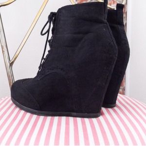 EUC with beautiful detail that mimics Oxford shoes. Very comfortable and give you height with wedge. Size 6, but I am a 6.5 and they fit perfectly.