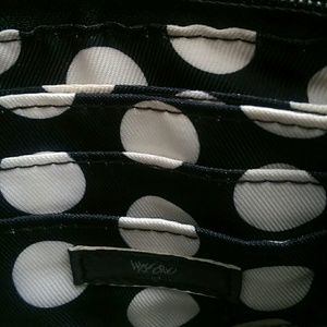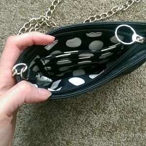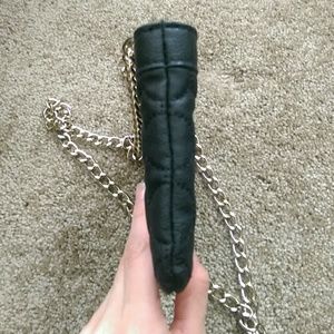 Small black Mossimo Crossbody bag with gold metal straps. Has 4 cardholder slots. Measurements are 6.5inches length, 4.25 inches height. Straps are about 2 feet when worn.