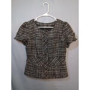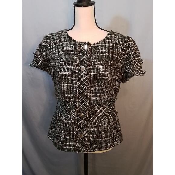 Mossimo black jacket Style , short sleeved, lined top with fringe detailing. Size M. Size M, 18" pit to pit, waist 16" and 21" length.