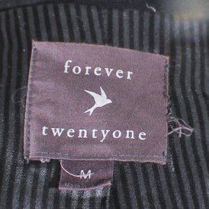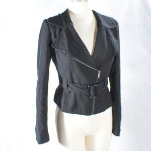 Black moto jacket. This is a everyday must have for any edgy rocker girl. Has a Joan Jett like edge and can be paired with your fav band tee, jeans and converse for a grungy dark mysterious aesthetic. Gothic, rocker, Moto, edgy. Forever 21 size med 53% wool 36% polyester 4% acrylic 3% rayon 3%nylon 1% Cotton, Liner is polyester. Liner is gray and black stripe, the inner label is coming off. Has waist belt.