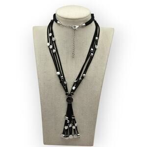 Black Multi Strand Cord Necklace Silver Beaded Tassel Drop Necklace