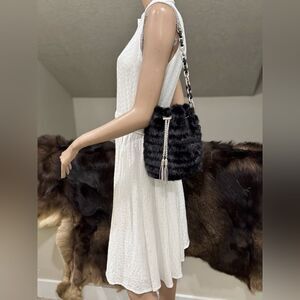 Only one available! Brand new. This gorgeous bucket bag is handmade from genuine Mink fur, with 3 strap styles, use in multiple ways, can be used as a wristlet, shoulder bag or cross body. Featuring a tassel detail, delicate and shiny rhinestone decoration.