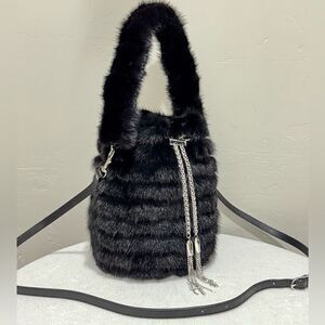 Black Multi Use Handmade Genuine Mink Fur & Drawstring Bucket Bag with 3 Straps