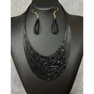 Black Multi-Strand Costume Beaded Necklace & Earrings Set